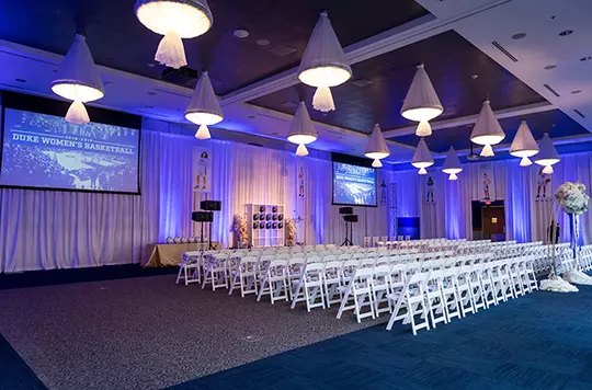 The 4,279-square-foot Champions Club offers a private, upscale event space perfect for weddings, dinners, parties and meetings. Featuring private restrooms, a full bar and 12 HD televisions with audiovisual capabilities, the club can accommodate 175 guests for seated events or 350 for standing receptions. Catering options range from cocktails and hors d'oeuvres to full dinner service, ensuring a tailored experience for any occasion. Convenient parking is available, and the space opens directly to the concourse of Cameron Indoor Stadium, offering a seamless flow for guests. During Duke men’s basketball season, the members-only Champions Club provides an exclusive game day experience for those looking to enjoy basketball at the highest level.