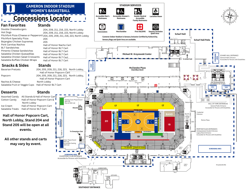 A great variety of food items and Coca-Cola products are available from the concession stands located throughout Cameron Indoor Stadium, operated by Proof of the Pudding. Concession stands are located on the lower level in the North Lobby behind Section 18 and on the upper level in the Hall of Honor and along the stadium concourse. An accessible concessions window is located at the stand in the North Lobby.